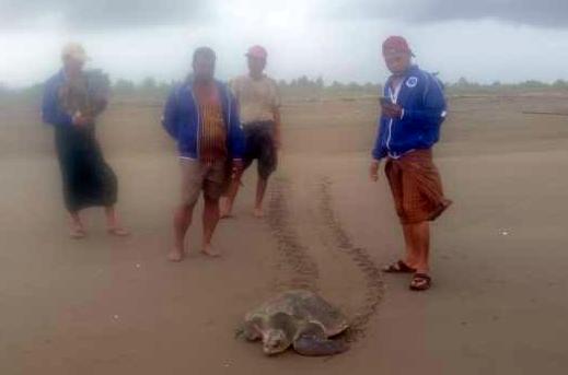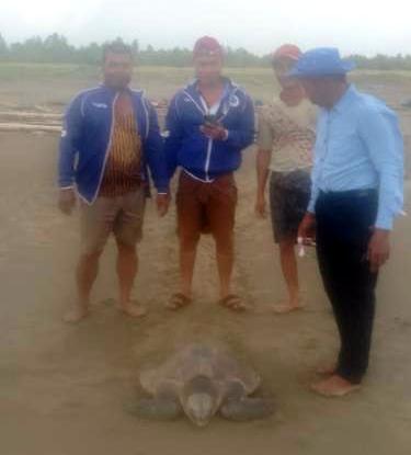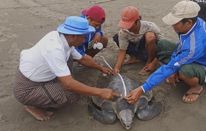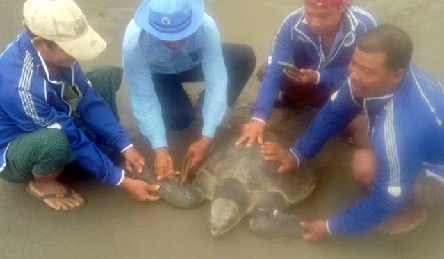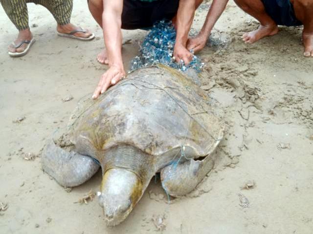 Staffs from Sea Turtle Conservation, Research and Education Station (Kadonkani) rescued a sea turtle alive after it was found entangled in discarded fishing nets in the waters, where located between the Htaung gyi tann turtle beach and the top side of Nga Mann turtle beach in Ahmar Sub-township, Bokalay Township, Pyapon District, Ayeyarwady Region, on 9 June 2025.